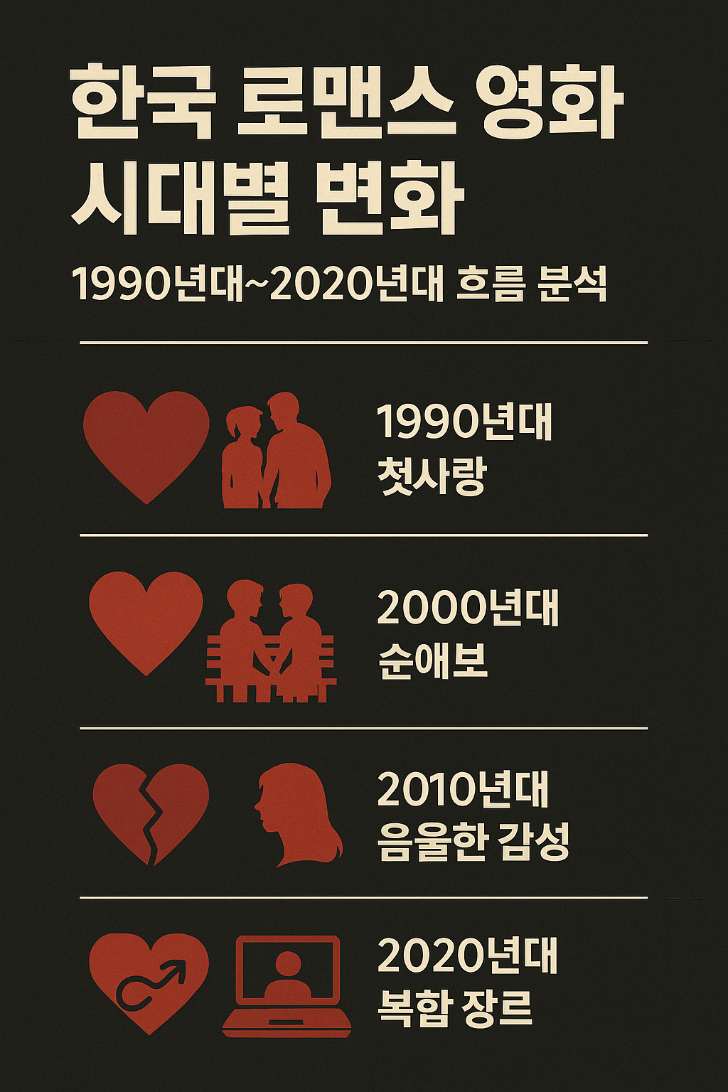 한국 로맨스영화는 시대의 사회상과 감성 트렌드를 반영하며 끊임없이 진화해왔습니다. 90년대 감성 멜로부터, 2000년대 로코 붐, 2010년대 현실 연애물, 그리고 2020년대의 장르 융합 로맨스까지, 세대와 감성에 따라 변화한 로맨스영화의 흐름을 시대별로 분석합니다. 그 흐름을 통해 한국 사회와 사랑의 인식 변화까지 읽을 수 있습니다.